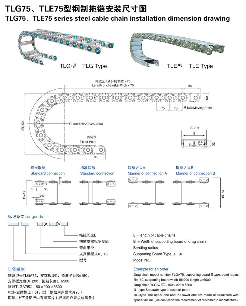 - 產(chǎn)品名稱: TLG75、TLE75型鋼制拖鏈安裝尺寸圖